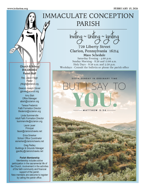 - Next Sunday: Sir 15:15-20 / Ps 119:1-2, 4-5, 17-18, 33-34 / 1 Cor 2:6-10 / Mt 5:17-37 or 5:20-22a, 27-28, 33-34a, 37